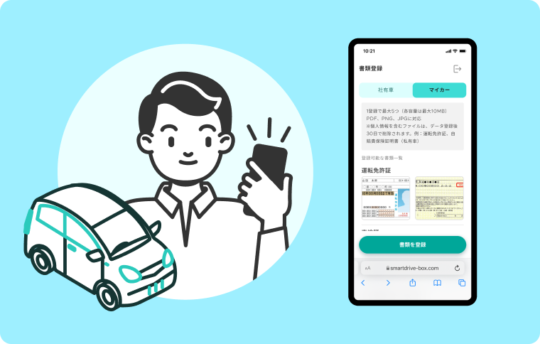 従業員の私有車を通勤や業務に利用する場合、会社にも管理責任が発生します。SmartDrive Boxは、免許証、車検証、任意保険の契約内容などをオンライン上で受付。不備アラートはもちろん、紛失リスクや個人情報保護の観点でも安心です。