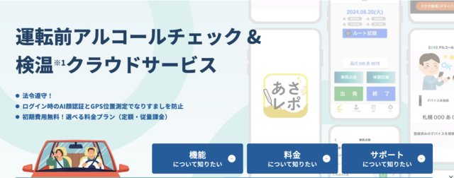 あさレポは、鈴与シンワートが提供するアルコールチェックと検温が行えるクラウドシステム。ISMSクラウドセキュリティ認証を取得し、「JISA Awards 2024 」Winnerも受賞している、信頼性が高いシステムです。専用アプリではAI顔認証とGPS位置情報によるなりすまし防止ができ、アルコールチェッカーは検温機能付きで健康管理も行えます。ニーズに合わせて2つの料金プランから選ぶことが可能です。